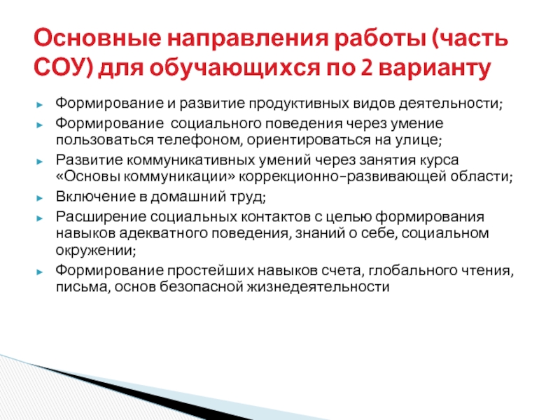 Слайд 40Основные направления работы (часть СОУ) для обучающихся по 2 варианту