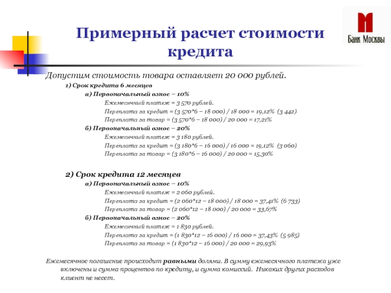 Переплата за кредит = (3 570*6 – 18 000) / 18 000 = 19,12% (3 442)