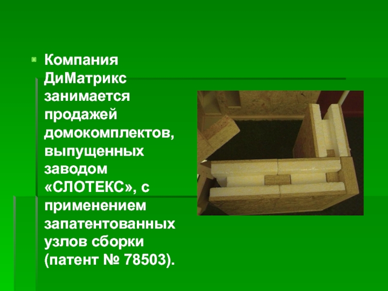 Слайд 5Компания ДиМатрикс занимается продажей домокомплектов, выпущенных заводом «СЛОТЕКС», с применением запатентованных
