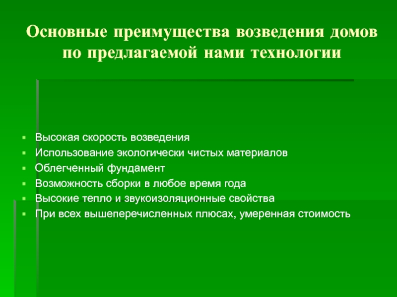 Слайд 2Основные преимущества возведения домов по предлагаемой нами технологии