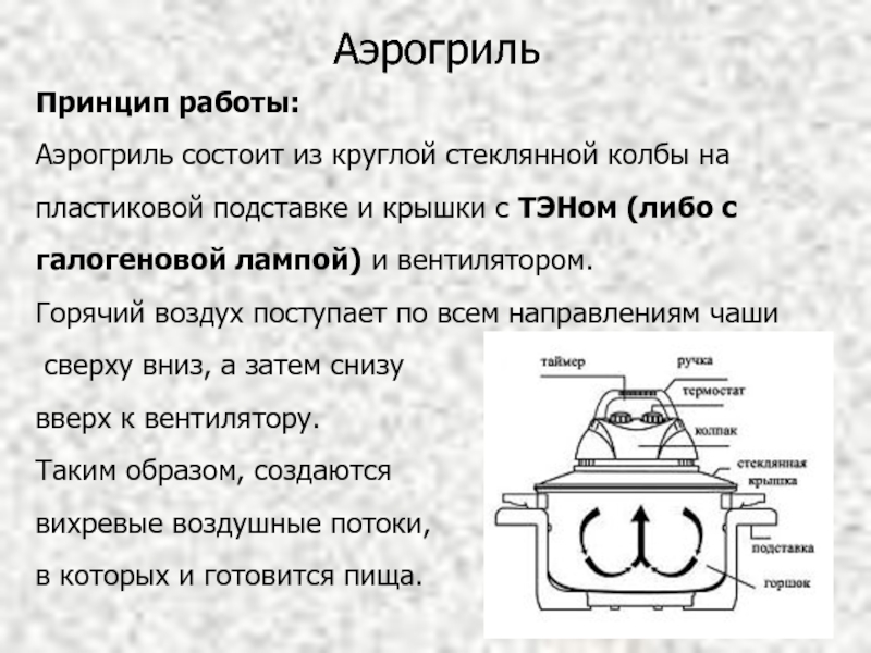 Аэрогриль состоит из круглой стеклянной колбы на пластиковой подставке и