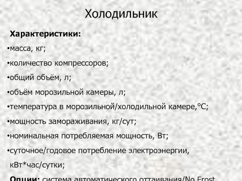 Опции: система автоматического оттаивания/No Frost, зона свежести, циркуляции воздуха в камере