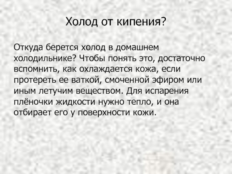 достаточно вспомнить, как охлаждается кожа, если протереть ее ваткой, смоченной эфиром или иным летучим веществом. Для испарения плёночки жидкости нужно тепло, и она отбирает его у поверхности кожи.