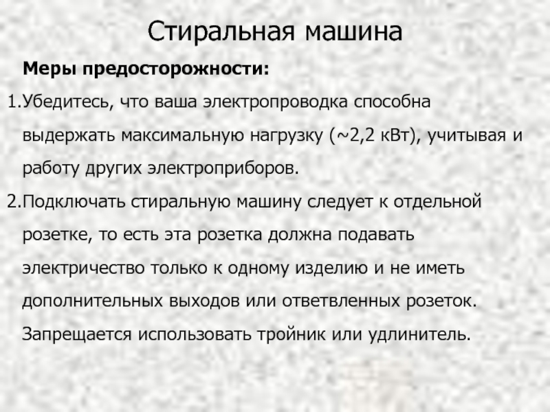 Подключать стиральную машину следует к отдельной розетке, то есть эта розетка должна подавать электричество только к одному изделию и не иметь дополнительных выходов или ответвленных розеток. Запрещается использовать тройник или удлинитель.