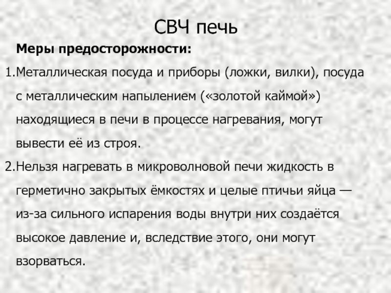 Нельзя нагревать в микроволновой печи жидкость в герметично закрытых ёмкостях и целые птичьи яйца — из-за сильного испарения воды внутри них создаётся высокое давление и, вследствие этого, они могут взорваться.