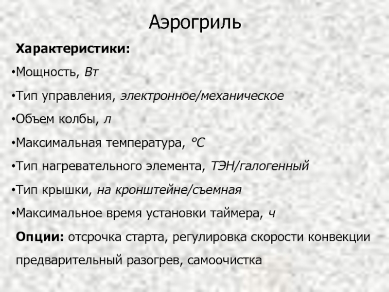 Опции: отсрочка старта, регулировка скорости конвекции предварительный разогрев, самоочистка