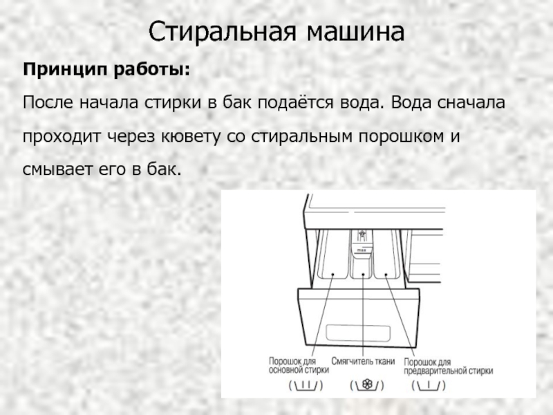 проходит через кювету со стиральным порошком и смывает его в бак.