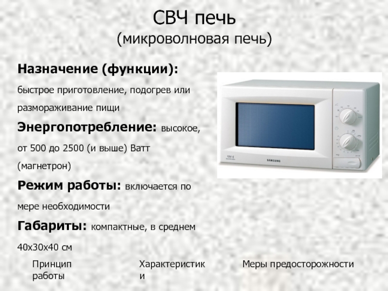 Назначение (функции): быстрое приготовление, подогрев или размораживание пищи Энергопотребление: