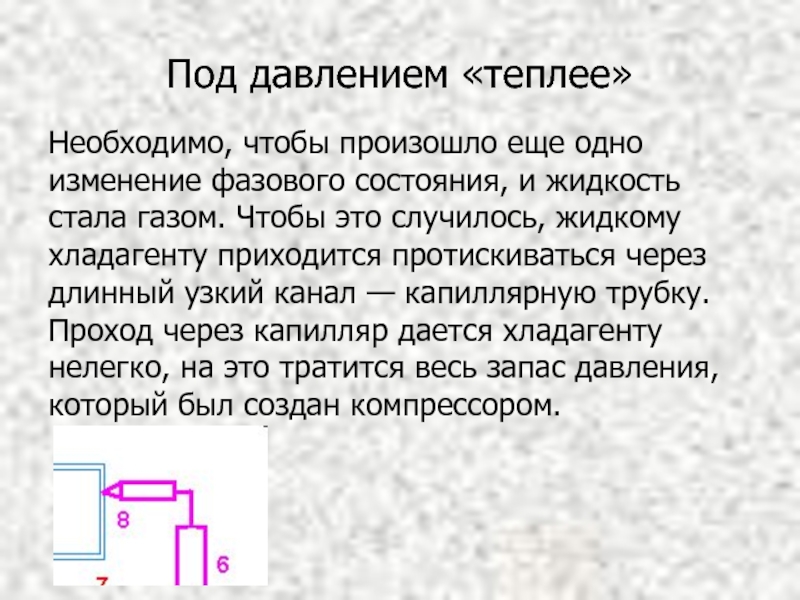 жидкость стала газом. Чтобы это случилось, жидкому хладагенту приходится протискиваться через длинный узкий канал — капиллярную трубку. Проход через капилляр дается хладагенту нелегко, на это тратится весь запас давления, который был создан компрессором.