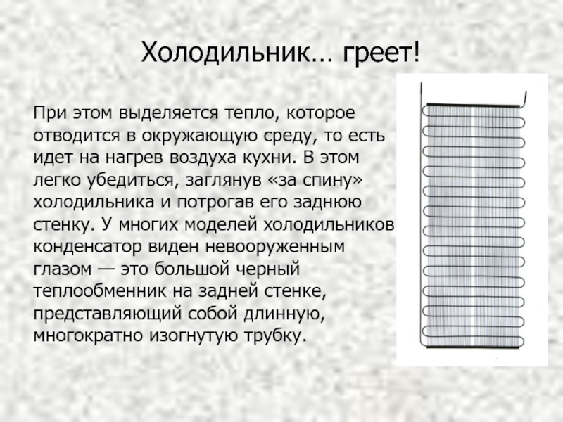 есть идет на нагрев воздуха кухни. В этом легко убедиться, заглянув «за спину» холодильника и потрогав его заднюю стенку. У многих моделей холодильников конденсатор виден невооруженным глазом — это большой черный теплообменник на задней стенке, представляющий собой длинную, многократно изогнутую трубку.