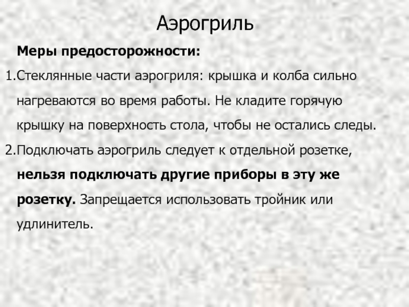 Подключать аэрогриль следует к отдельной розетке, нельзя подключать другие приборы в эту же розетку. Запрещается использовать тройник или удлинитель.