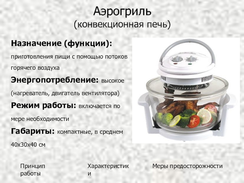 Назначение (функции): приготовления пищи с помощью потоков горячего воздуха Энергопотребление:
