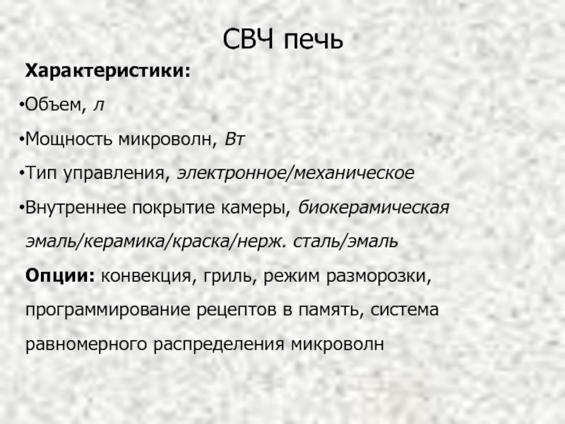 Опции: конвекция, гриль, режим разморозки, программирование рецептов в память, система равномерного распределения микроволн