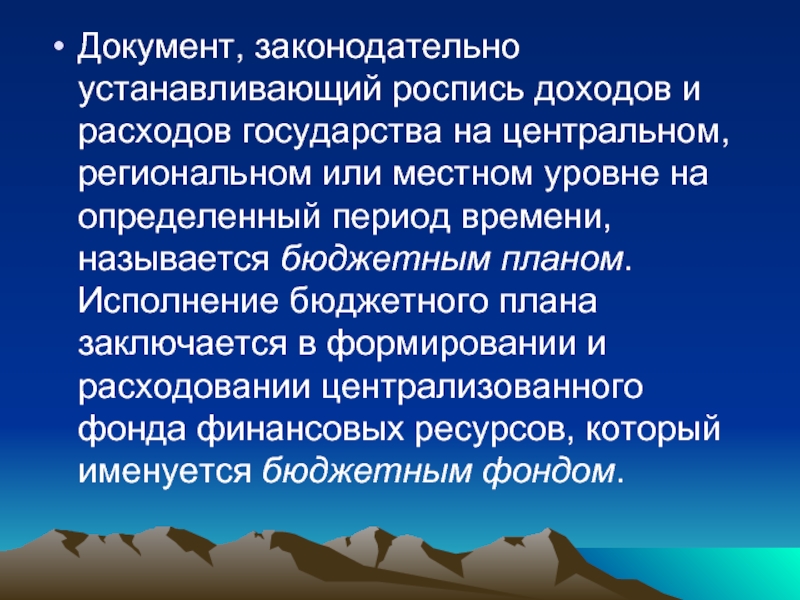 или местном уровне на определенный период времени, называется бюджетным планом. Исполнение бюджетного плана заключается в формировании и расходовании централизованного фонда финансовых ресурсов, который именуется бюджетным фондом.