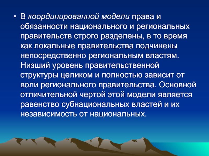 Слайд 14В координированной модели права и обязанности национального и региональных правительств строго
