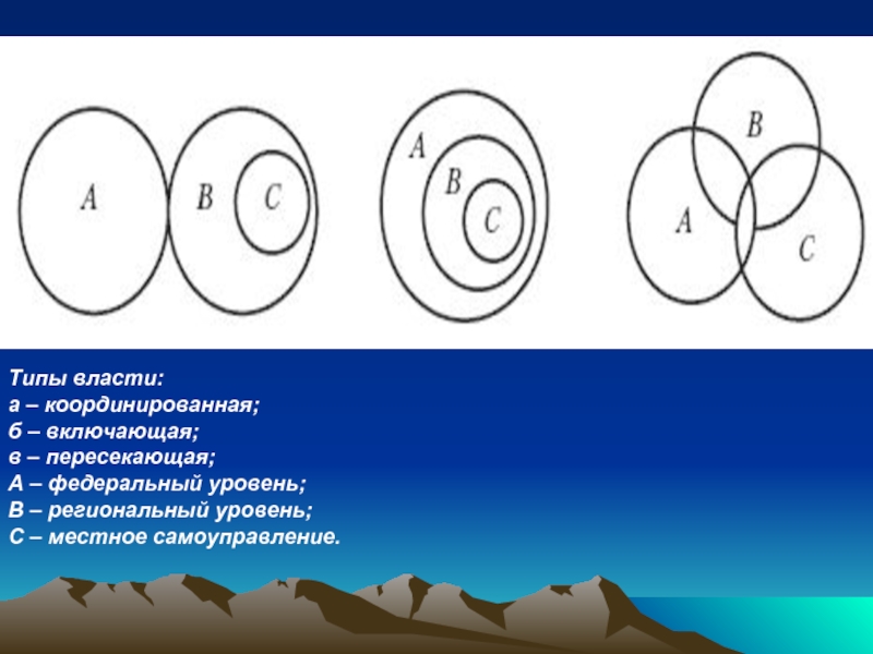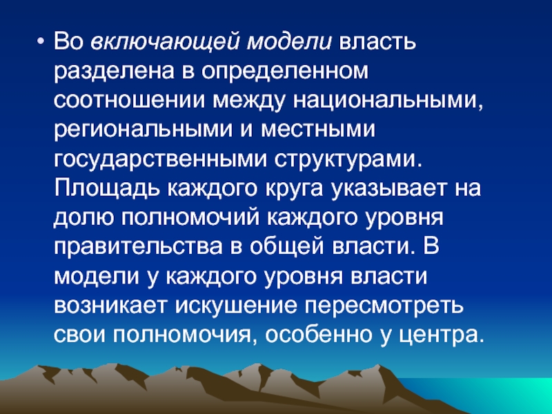 Слайд 15Во включающей модели власть разделена в определенном соотношении между национальными, региональными
