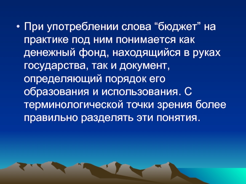 Слайд 5При употреблении слова “бюджет” на практике под ним понимается как денежный
