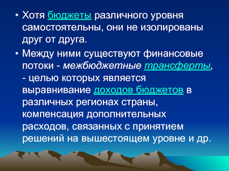 Слайд 10Хотя бюджеты различного уровня самостоятельны, они не изолированы друг от друга.