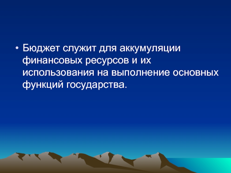 Слайд 3Бюджет служит для аккумуляции финансовых ресурсов и их использования на выполнение