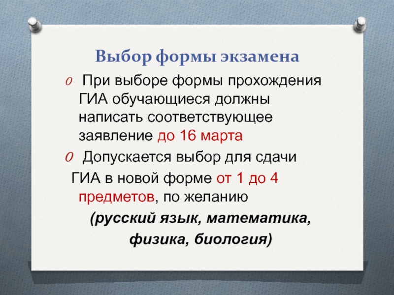 1) физика и биология по желанию обучающегося может сдаваться либо в новой форме, либо традиционно (по билетам)