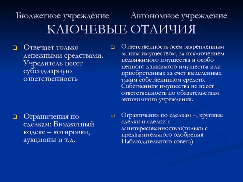 Ответственность всем закрепленным за ним имуществом, за исключением недвижимого имущества и особо ценного движимого имущества или приобретенных за счет выделенных таким собственником средств. Собственник имущества не несет ответственность по обязательствам автономного учреждения.