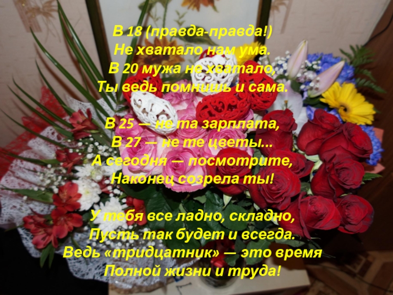 помнишь и сама. В 25 — не та зарплата, В 27 — не те цветы... А сегодня — посмотрите, Наконец созрела ты! У тебя все ладно, складно, Пусть так будет и всегда. Ведь «тридцатник» — это время Полной жизни и труда!