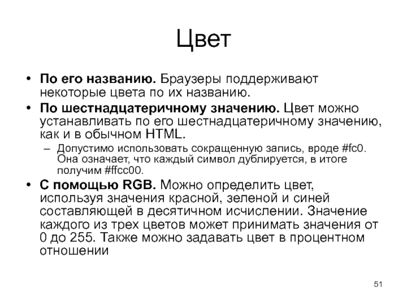 Слайд 51Цвет По его названию. Браузеры поддерживают некоторые цвета по их названию. По