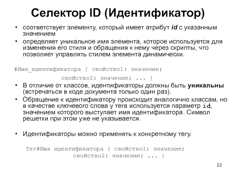 Слайд 22Селектор ID (Идентификатор) соответствует элементу, который имеет атрибут id с указанным значением определяет