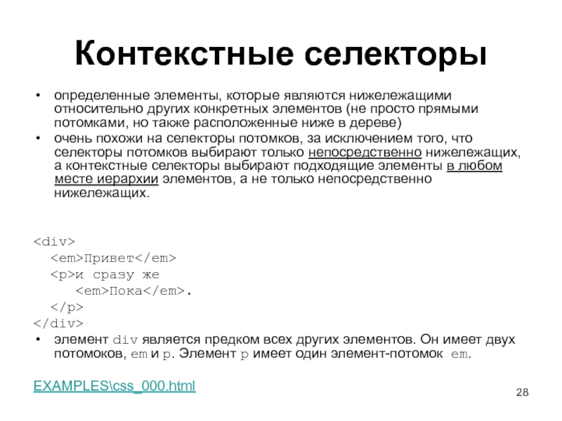 Слайд 28Контекстные селекторы определенные элементы, которые являются нижележащими относительно других конкретных элементов (не