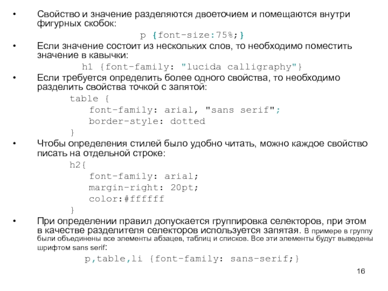 {font-size:75%;} Если значение состоит из нескольких слов, то необходимо поместить значение в кавычки: h1 {font-family: "lucida calligraphy"} Если требуется определить более одного свойства, то необходимо разделить свойства точкой с запятой: table { font-family: arial, "sans serif"; border-style: dotted } Чтобы определения стилей было удобно читать, можно каждое свойство писать на отдельной строке: h2{ font-family: arial; margin-right: 20pt; color:#ffffff } При определении правил допускается группировка селекторов, при этом в качестве разделителя селекторов используется запятая. В примере в группу были объединены все элементы абзацев, таблиц и списков. Все эти элементы будут выведены шрифтом sans serif: p,table,li {font-family: sans-serif;}