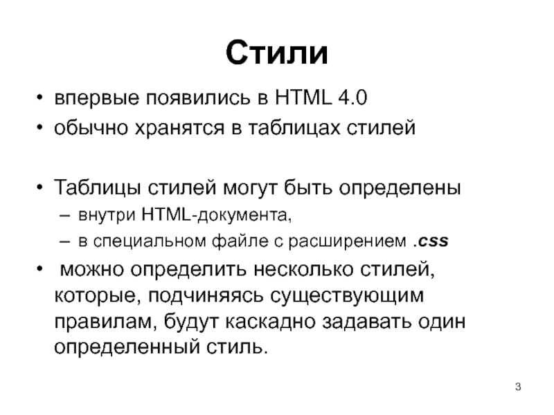 Слайд 3Стили впервые появились в HTML 4.0 обычно хранятся в таблицах стилей