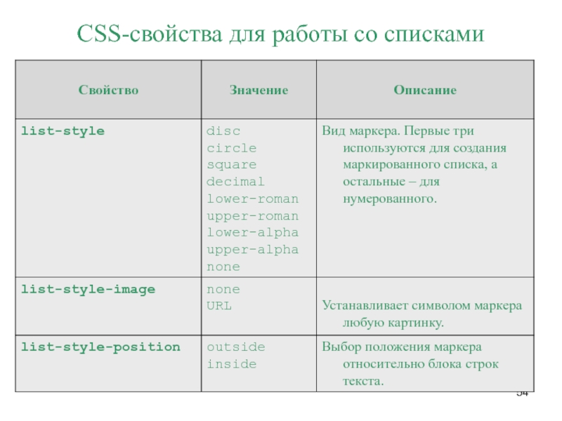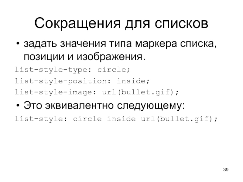Слайд 39Сокращения для списков задать значения типа маркера списка, позиции и изображения. list-style-type: