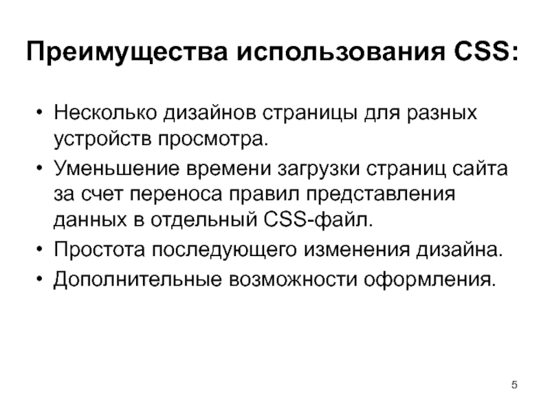 Слайд 5Преимущества использования CSS: Несколько дизайнов страницы для разных устройств просмотра. Уменьшение времени