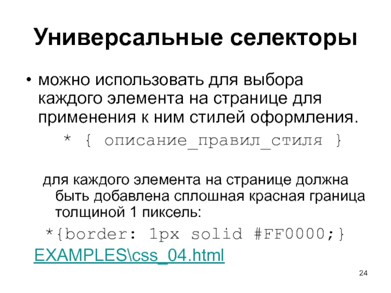 Слайд 24Универсальные селекторы можно использовать для выбора каждого элемента на странице для применения