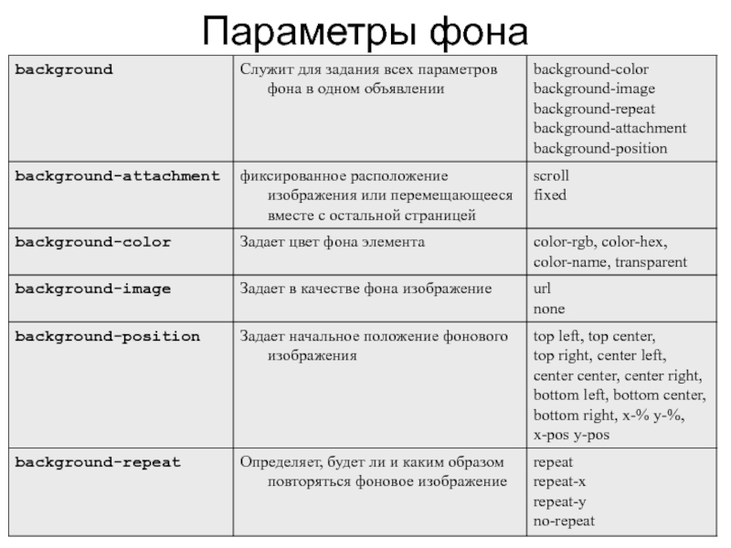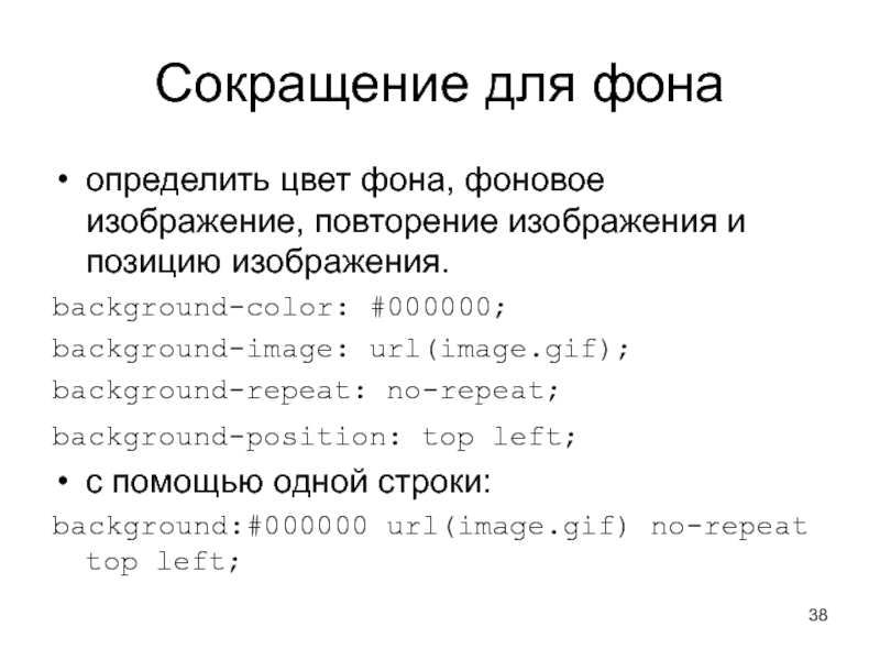 Слайд 38Сокращение для фона определить цвет фона, фоновое изображение, повторение изображения и позицию