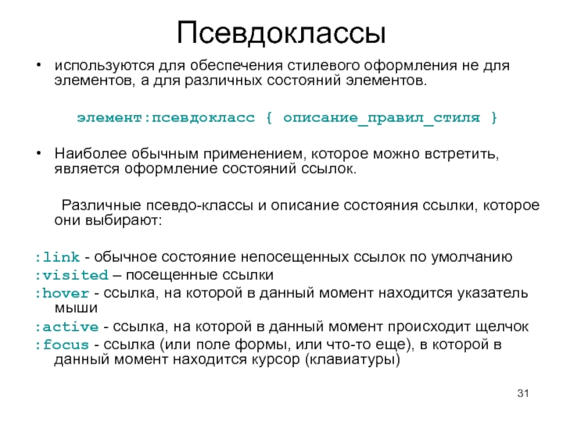 Слайд 31Псевдоклассы используются для обеспечения стилевого оформления не для элементов, а для