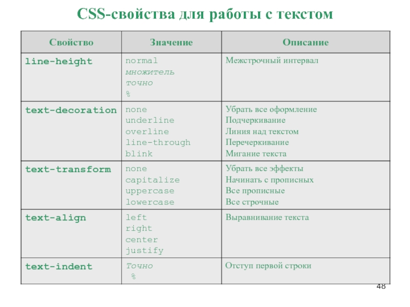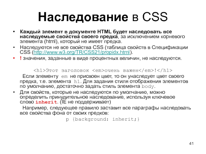 свойства своего предка, за исключением корневого элемента (html), который не имеет предка. Наследуются не все свойства CSS (таблица свойств в Спецификации CSS (http://www.w3.org/TR/CSS21/propidx.html). ! значения, заданные в виде процентных величин, не наследуются.