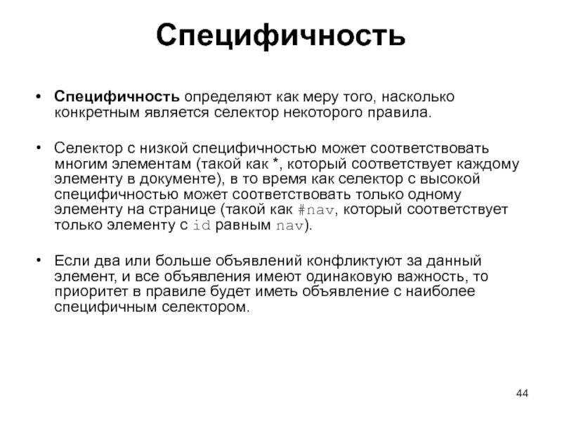 Селектор с низкой специфичностью может соответствовать многим элементам (такой как *, который соответствует каждому элементу в документе), в то время как селектор с высокой специфичностью может соответствовать только одному элементу на странице (такой как #nav, который соответствует только элементу с id равным nav).