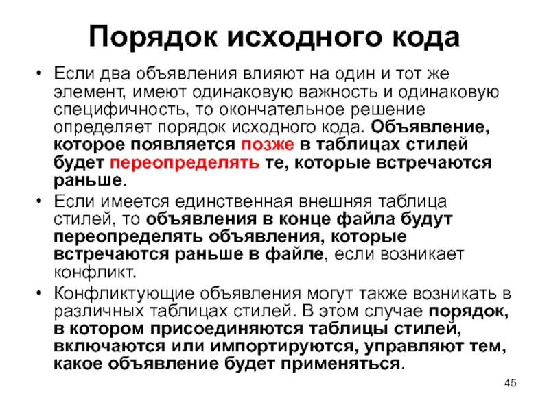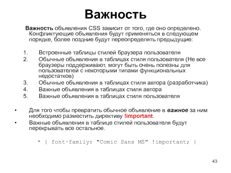 Слайд 43Важность Важность объявления CSS зависит от того, где оно определено. Конфликтующие объявления