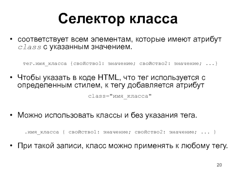 Слайд 20Селектор класса соответствует всем элементам, которые имеют атрибут class с указанным значением.