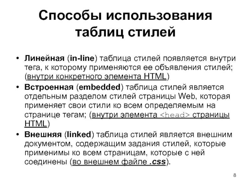 Слайд 8Способы использования таблиц стилей Линейная (in-line) таблица стилей появляется внутри тега,
