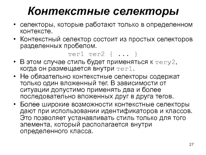 Слайд 27Контекстные селекторы селекторы, которые работают только в определенном контексте. Контекстный селектор состоит из