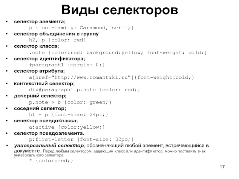 Слайд 17Виды селекторов селектор элемента; p {font-family: Garamond, serif;} cелектор объединения в группу h2, p