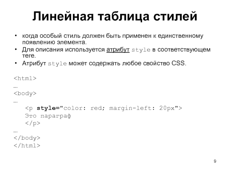 Слайд 9Линейная таблица стилей когда особый стиль должен быть применен к единственному появлению