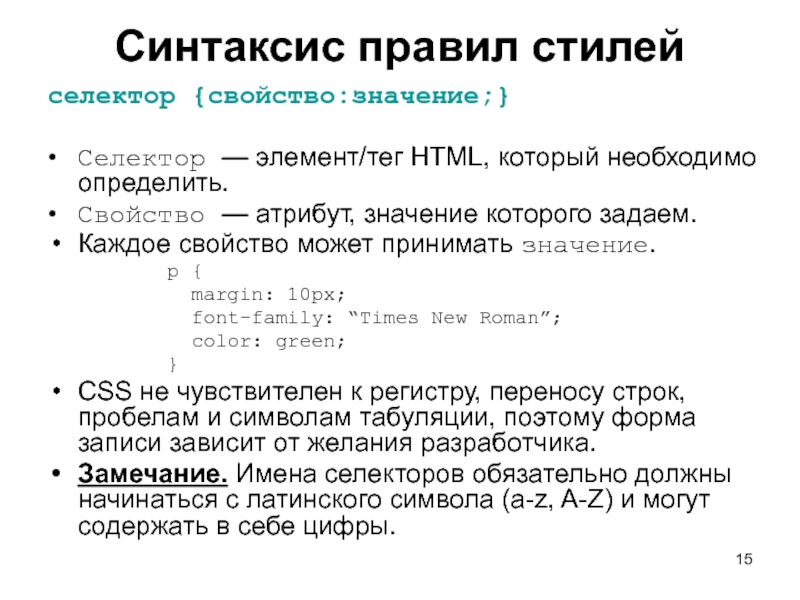 — атрибут, значение которого задаем. Каждое свойство может принимать значение. p { margin: 10px; font-family: “Times New Roman”; color: green; } CSS не чувствителен к регистру, переносу строк, пробелам и символам табуляции, поэтому форма записи зависит от желания разработчика. Замечание. Имена селекторов обязательно должны начинаться с латинского символа (a-z, A-Z) и могут содержать в себе цифры.