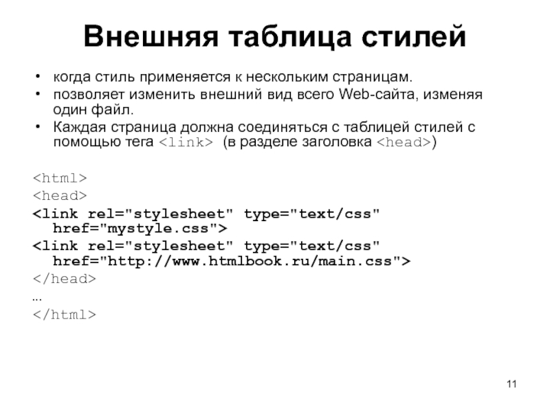 Слайд 11Внешняя таблица стилей когда стиль применяется к нескольким страницам. позволяет изменить внешний