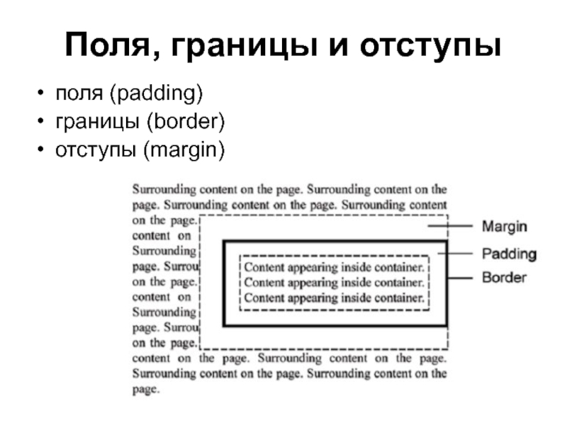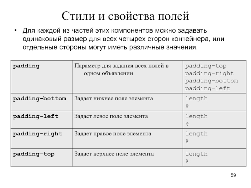 правило для полей (сокращения для отступов и границ работают таким же образом): div.foo { margin-top: 1px; margin-right: 1.5px; margin-bottom: 2px; margin-left: 2.5px; } Это правило можно записать короче: