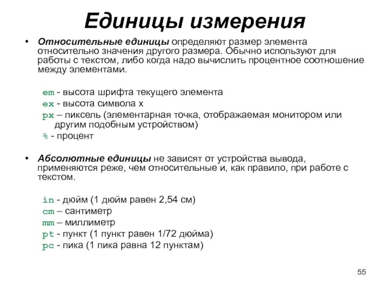 Слайд 55Единицы измерения Относительные единицы определяют размер элемента относительно значения другого размера. Обычно