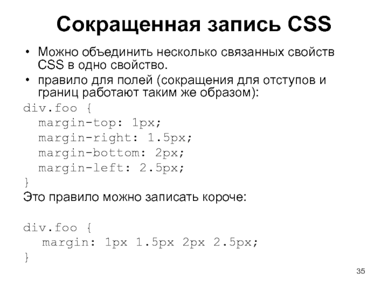 Слайд 35Сокращенная запись CSS Можно объединить несколько связанных свойств CSS в одно свойство.