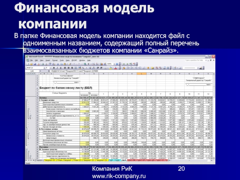 В папке Финансовая модель компании находится файл с одноименным названием, содержащий полный перечень взаимосвязанных бюджетов компании «Санрайз».